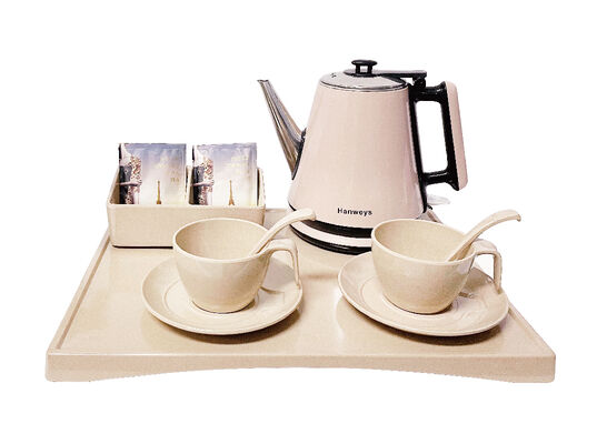 Un plateau écologique, une boîte à tissus, une boîte à feuilles de thé, un savon, une serviette, une tasse de café avec une cuillère et une soucoupe.Boîte de produits de toilette